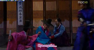 Raja menyerah, ia melempar gulungan laporan (yang beberapa waktu lalu membuat Raja marah2 karena para menteri tidak melaporkan semua masalah padanya, sekarang taruhan..Raja pasti berharap Menteri Shim San atau siapa itu menyembunyikan beberapa gulung laporan haha). Lalu menundukkan kepala. Tiba2 Raja seperti punya ide.